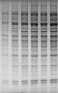 注解↑ 免染膠成像效果, 從左至右為2倍梯度加樣全蛋白 |