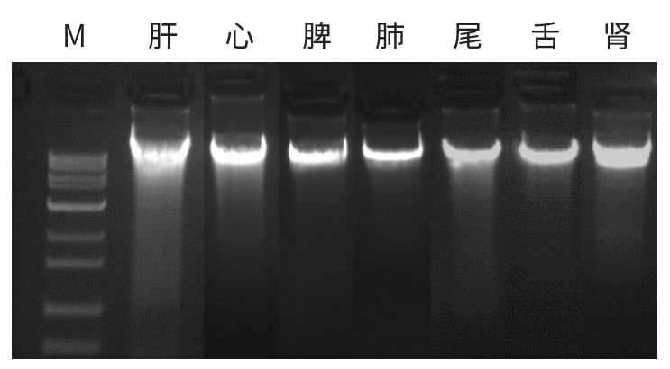 | 使用ZP332提取10-15mg小鼠不同組織的DNA,洗脫體積:50uL。 1%瓊脂糖凝膠電泳,5v/cm 電泳15 min,上樣量:3ul。