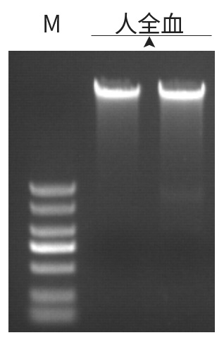 | 使用ZP332提取200μL新鮮人全血DNA,洗脫體積:50uL。 1%瓊脂糖凝膠電泳,5v/cm 電泳15 min,上樣量:2uL。