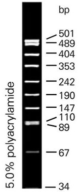 本產(chǎn)品是即用型由pUC19質(zhì)粒經(jīng)MspI完全酶切得到的,包括501,489,404,352,242,190,147,110,110,89,67,34bp DNA片段,適用于瓊脂糖或聚丙烯酰胺凝膠電泳中DNA條帶的分析。