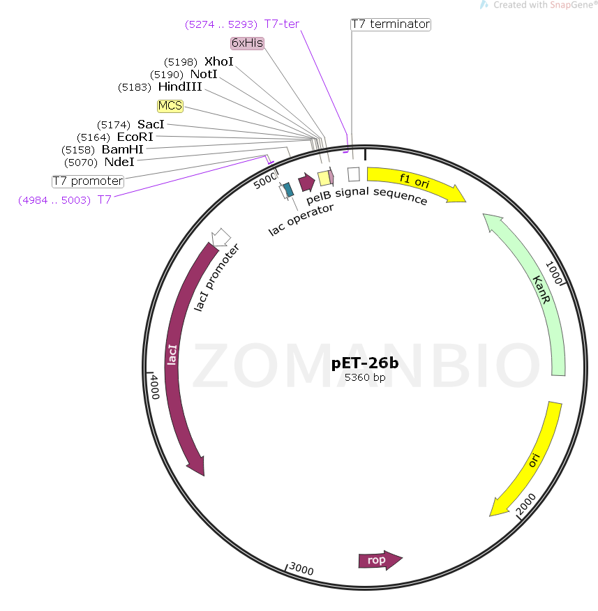 pET-26b質(zhì)粒是一種原核表達(dá)載體,C端含有一個(gè)6×His標(biāo)簽,N端含有一個(gè)pelB前導(dǎo)肽。該質(zhì)粒含有多個(gè)常用的酶切位點(diǎn),便于不同基因克隆。表達(dá)由宿主細(xì)胞提供的T7 RNA聚合酶誘導(dǎo),目的基因被克隆到質(zhì)粒載體上,受噬菌體強(qiáng)轉(zhuǎn)錄及翻譯信號控制。