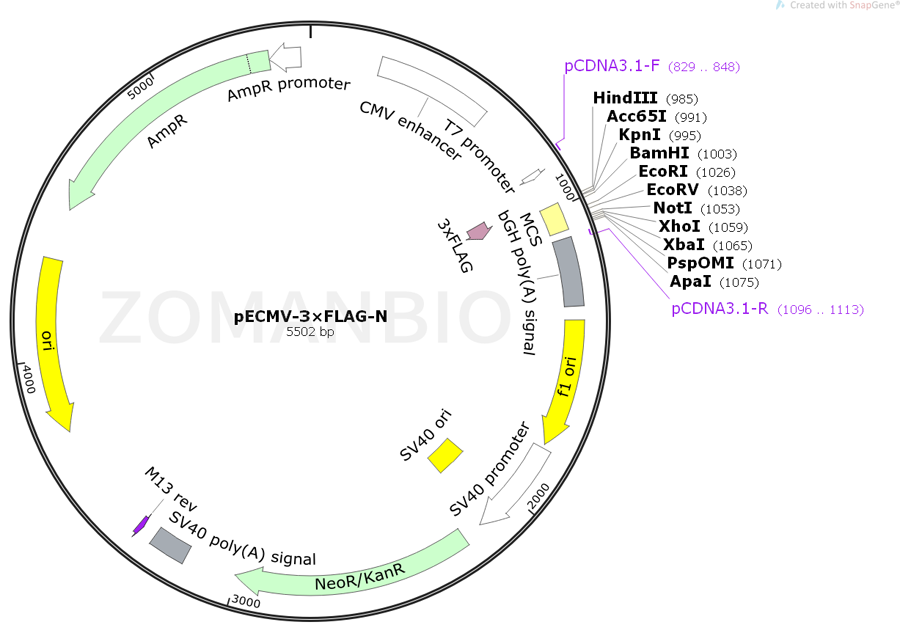 pECMV-3×FLAG-N含有一個(gè)在哺乳動(dòng)物細(xì)胞中高水平表達(dá)的強(qiáng)啟動(dòng)子CMV,以及易于用抗體檢測的3×FLAG標(biāo)簽,可用G418來篩選穩(wěn)定細(xì)胞系,多克隆位點(diǎn)MCS處有豐富的酶切位點(diǎn),可以用來連接目的片段,進(jìn)而和3×FLAG融合表達(dá)。
