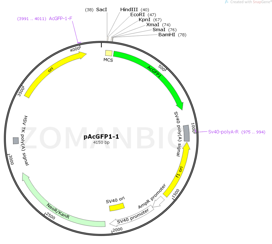pAcGFP1-1質(zhì)粒是 AcGFP的衍生物,來自Aequorea coerulescens。 AcGFP1已經(jīng)優(yōu)化了更亮的熒光。(激發(fā)最大值= 475nm;發(fā)射最大值= 505nm)AcGFP1基因的編碼序列含有沉默堿基變化,其對(duì)應(yīng)于人類密碼子使用偏好。