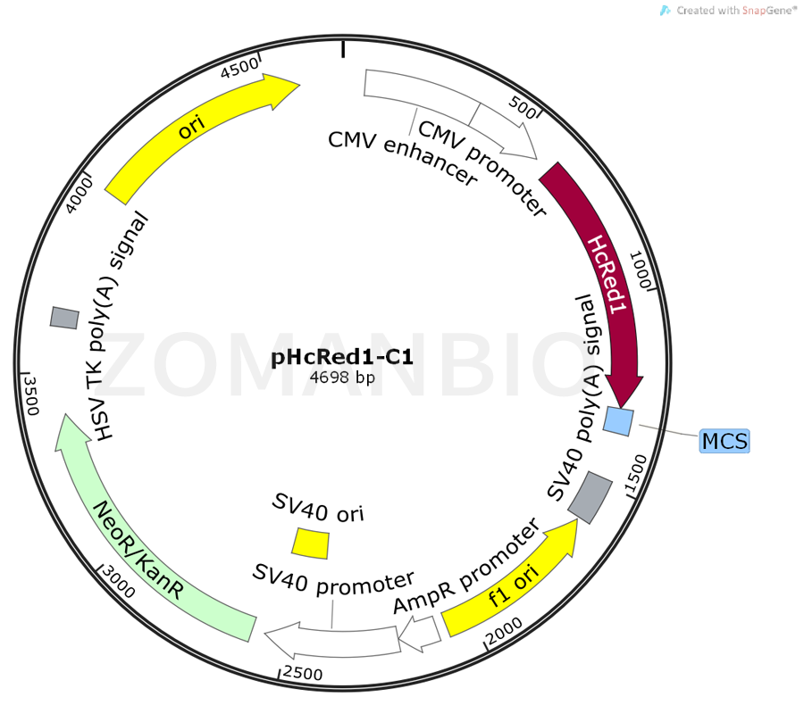pHcRed1-C1質(zhì)粒是一個(gè)哺乳細(xì)胞紅色熒光蛋白表達(dá)載體,CMV IE啟動(dòng)子驅(qū)動(dòng)HcRed1紅色熒光蛋白基因和目的基因融合表達(dá)。