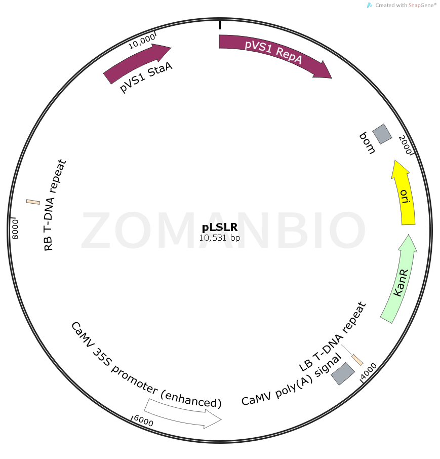 pLSLR是一個(gè)植物的T-DNA質(zhì)粒,擁有潮霉素篩選標(biāo)記。Single component plant T-DNA plasmid. Contains cis- and trans-acting replicational elements from the bean yellow dwarf virus in an LIR-SIR-Rep/RepA-LIR orientation.