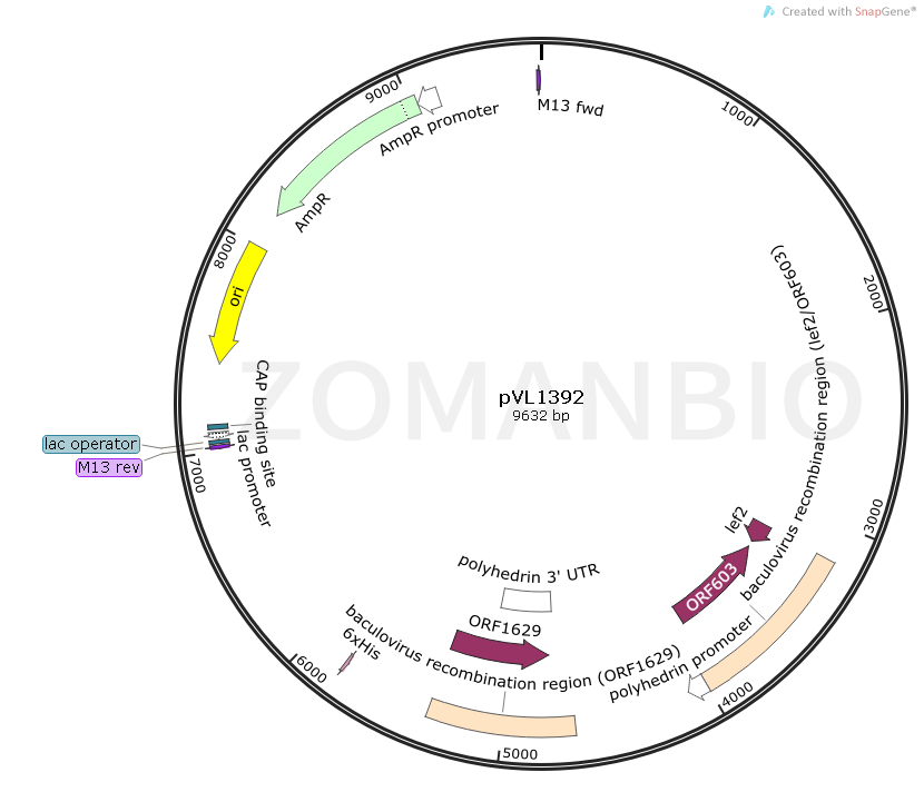 pVL1392 and pVL1393 are 9.8 kb vectors designed for use as baculovirus transfer vectors. These transfer vectors contain recombination sequences which are homologous to sequences in the baculovirus genome.Upon cotransfection, these sequences undergo homologous recombination resulting in a recombinant viral genome packaged in infectious viral particles.
